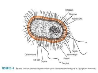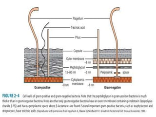 This document discusses three key components of bacterial cell walls: 1) Peptidoglycan surrounds the entire bacterial cell and provides rigidity and shape. It is composed of sugars and peptides linked in a complex network. 2) Lipopolysaccharide (LPS) is found in the outer membrane of gram-negative bacteria and is responsible for endotoxic effects like fever and shock. It has three distinct parts including lipid A that causes toxicity. 3) Teichoic acid extends from the outer layer of gram-positive cell walls. It can be linked to the cytoplasmic membrane and induce septic shock similarly to LPS. Teichoic acid also helps attachment of bacteria to cells.