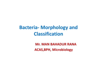This document discusses the morphology, classification, and environmental requirements of bacteria. It describes the typical sizes and shapes of bacteria, including cocci, bacilli, vibrios, spirilla, and spirochetes. It also explains how bacteria can be arranged in pairs, chains, clusters, or other groupings. Additionally, it classifies bacteria based on their temperature and oxygen requirements, such as mesophiles, psychrophiles, thermophiles, hyperthermophiles, aerobes, anaerobes, and microaerophiles. Enzymes like catalase and superoxide dismutase that help bacteria detoxify harmful oxygen byproducts are also mentioned.