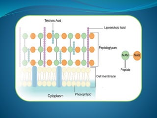 This document provides information on the structure of bacterial cells. It discusses the key components of bacterial cells including the cell wall, plasma membrane, flagella, pili, nucleoid region, ribosomes, and inclusion bodies. It notes that bacteria can be either gram-positive or gram-negative and describes the differences in their cell wall structures. The document also discusses cellular structures like endospores, cysts, and vacuoles that allow bacteria to survive in harsh environmental conditions.