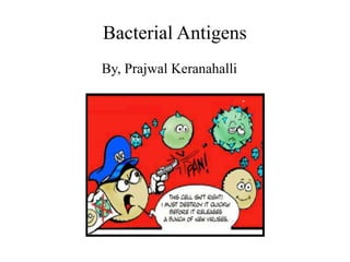 The document discusses bacterial antigens, which are molecules found on bacterial surfaces that are detected by the human body's immune cells like macrophages and B cells. When B cells detect antigens, they create antibodies to mark bacteria for destruction. There are primary antibodies gathered from animals and secondary antibodies that can be tagged with fluorescent markers. While antigens allow bacteria to be detected by the human immune system, they may remain on bacteria for important functions like inter-bacterial communication through quorum sensing or because some antigens are critical for bacterial survival and highly conserved.