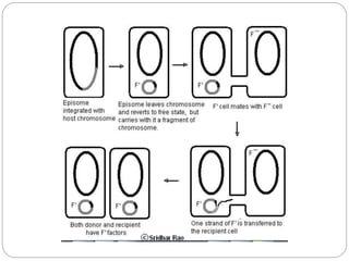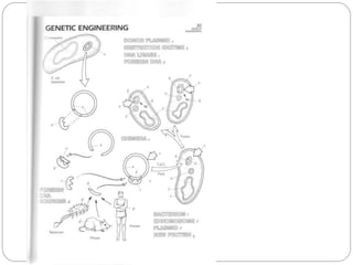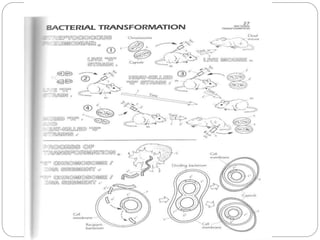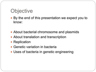 Bacterial genetics involves the study of bacterial chromosomes, plasmids, transcription, translation, replication, and genetic variation. Bacteria store DNA in circular chromosomes and small plasmids. Transcription and translation allow genes to be expressed. Replication duplicates genetic material. Bacteria undergo genetic variation through mutation, transformation, conjugation, and transduction, allowing them to adapt. Genetic engineering uses bacteria to produce recombinant proteins for research and medical purposes like vaccines.