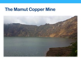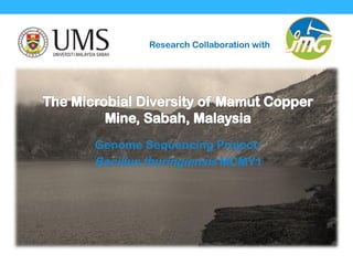 The document discusses a research collaboration on the genome sequencing of Bacillus thuringiensis MCMy1 in relation to acid mine drainage at the Mamut copper mine in Sabah, Malaysia. Key research questions involve investigating genetic mechanisms for adaptation, evidence of horizontal gene transfer, and features associated with metal tolerance. The study includes microbial isolation and characterization, genome sequencing, and concludes that the genome encodes genes for exo-polysaccharide biosynthesis without evidence of plasmids.