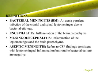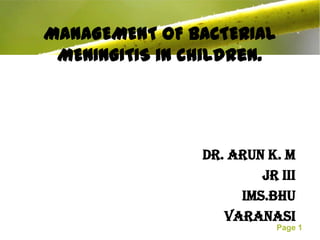 This document discusses the management of bacterial meningitis in children. It defines bacterial meningitis and related terms. The most common causes are Neisseria meningitidis, Streptococcus pneumoniae, and Haemophilus influenzae type b. Risk factors include age and immune deficiencies. Diagnosis involves lumbar puncture and cerebrospinal fluid analysis showing pleocytosis, low glucose, and high protein. Treatment involves intravenous antibiotics and management of increased intracranial pressure. Outcomes depend on early diagnosis and treatment.