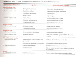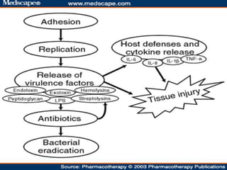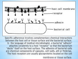 This document provides an overview of bacterial pathogenesis. It discusses Koch's postulates, virulence factors, types of infections, mechanisms of pathogenesis including transmission, adherence, invasion, inflammation and toxin production. Key points covered include the definition of a pathogen and virulence, examples of virulence factors for common bacteria, how bacteria adhere and invade host tissues, and the role of exotoxins and endotoxins in disease.