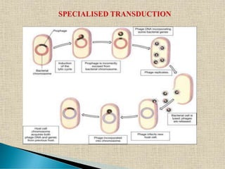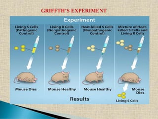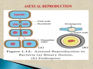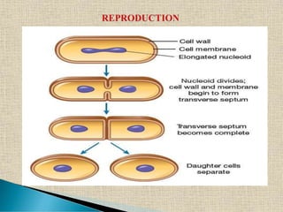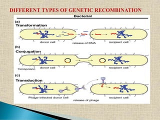 The document presents an intricate overview of bacterial reproduction, distinguishing between vegetative, asexual, and a variant of sexual reproduction through genetic recombination methods such as conjugation, transformation, and transduction. It details various processes including binary fission, the formation of endospores, and the role of mobile DNA elements in genetic transfer among bacteria. The document also highlights landmark experiments in genetic transformation, notably those by Griffith and Avery, contributing significantly to microbiological genetic research.