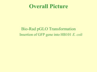 This document discusses bacterial transformation, which is the process of transferring foreign DNA into bacterial host cells. It describes how the pGLO plasmid containing GFP and beta-lactamase genes is used to transform E. coli HB101 host cells. The process involves cutting the plasmid with restriction enzymes, joining it with DNA fragments using DNA ligase, making the host cells competent, and selecting transformed cells on antibiotic-containing media. GFP is used as a reporter to identify transformed cells expressing the plasmid genes.