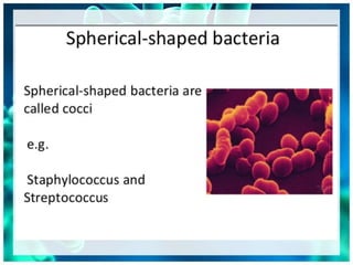This document discusses various methods for classifying bacteria, including morphological, anatomical, staining, cultural, nutritional, and environmental characteristics. Morphologically, bacteria are classified as cocci, bacilli, actinomycetes, spirochaetes, mycoplasmas, or rickettsiae/chlamydiae based on their shape and arrangement. Anatomical features used in classification include presence of capsules, flagella, and ability to form spores. Staining characteristics such as Gram-stain and acid-fast reactions also provide means of classification. Cultural characteristics like growth requirements, hemolysis, carbohydrate utilization, growth rate, and pigment production further differentiate bacterial types. Environmental tolerances