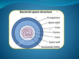 This document provides information on the structure of bacterial cells. It discusses the key components of bacterial cells including the cell wall, plasma membrane, flagella, pili, nucleoid region, ribosomes, and inclusion bodies. It notes that bacteria can be either gram-positive or gram-negative and describes the differences in their cell wall structures. The document also discusses cellular structures like endospores, cysts, and vacuoles that allow bacteria to survive in harsh environmental conditions.