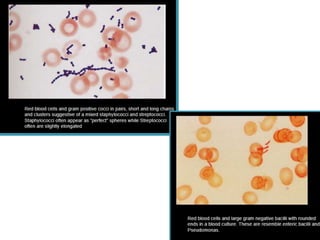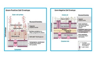 Bacteria have either a gram-positive or gram-negative cell wall structure. Gram-positive bacteria have a thick peptidoglycan layer that retains crystal violet dye, while gram-negative bacteria have a thinner peptidoglycan layer and lipopolysaccharide outer membrane, causing them to take up the counterstain. Bacterial cell walls provide shape, protection from osmotic damage, and are the target of antibiotics.