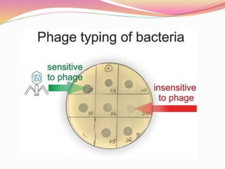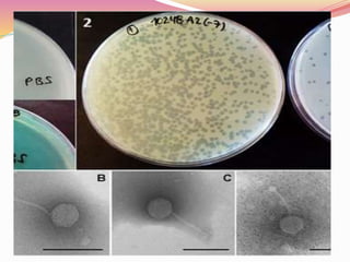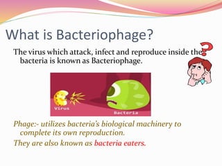 Bacteriophages are viruses that specifically infect bacteria, using the host's cellular machinery for replication and reproduction. They have complex structures, exist in lytic and lysogenic life cycles, and can be transmitted between bacteria via transduction. While they offer advantages as potential antibiotics against resistant bacteria, their use is limited by specificity and a lack of extensive efficacy studies.