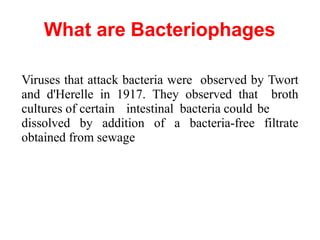Bacteriophages are viruses that infect and replicate inside bacteria. They were first observed in 1917 by Twort and d'Herelle who noticed that bacterial cultures could be dissolved by adding filtrate from sewage. Bacteriophages have complex structures when viewed under electron microscopes and there are over 5000 types classified into 13 families. They carry only the genetic information needed for replication and use the host cell's machinery. Bacteriophages can induce lysogenic conversion by integrating their DNA into the host chromosome, which may enhance the host's virulence by allowing it to produce toxins. They have potential medical applications as alternatives to antibiotics.