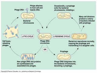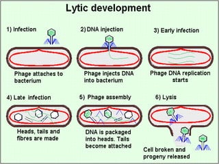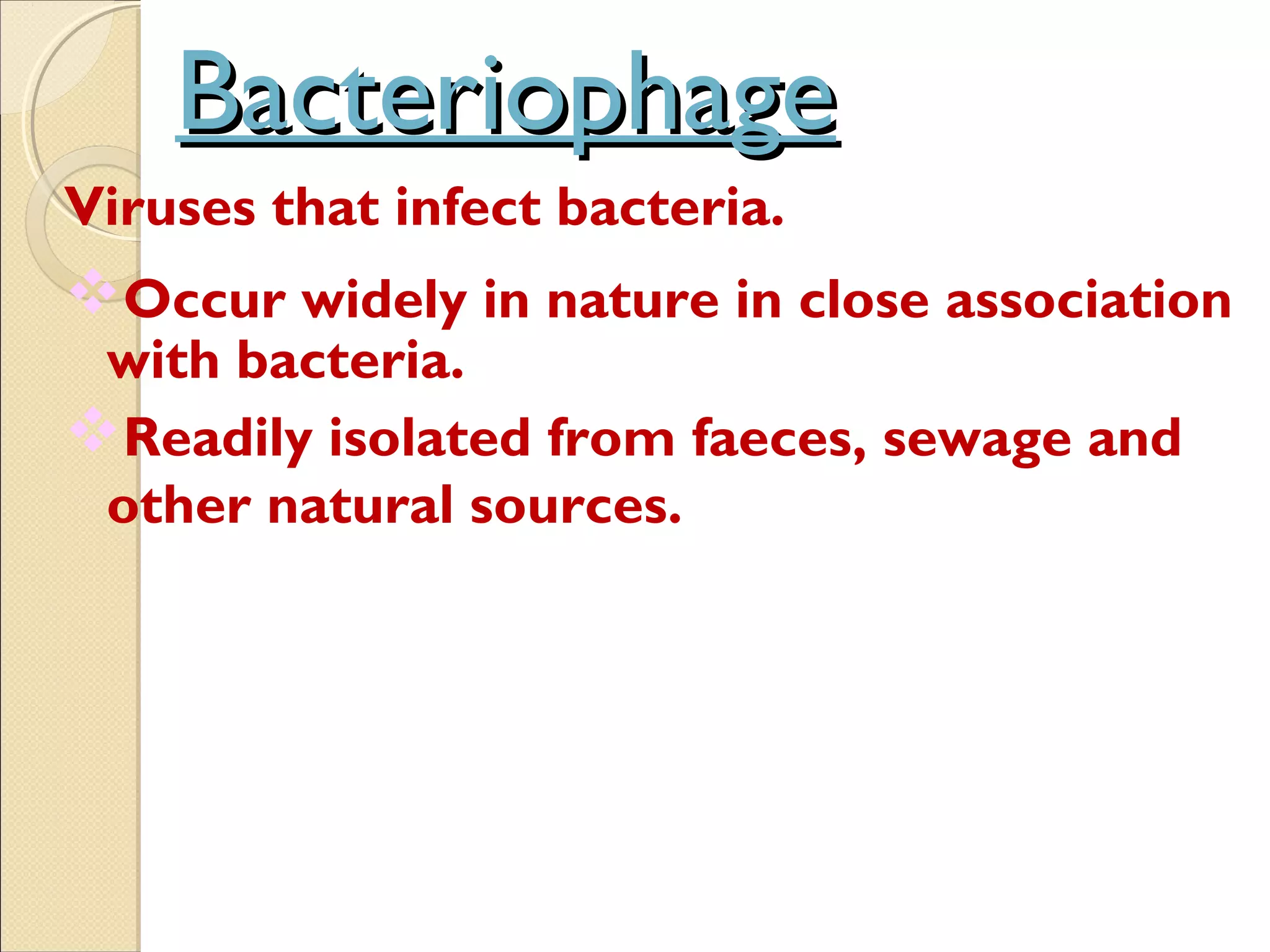 Bacteriophage are viruses that infect bacteria, characterized by their tadpole shape and dual life cycles: lytic, which leads to the destruction of the host bacterium, and lysogenic, where the phage integrates into the bacterial chromosome. During the lytic cycle, the phage attaches to a bacterium, injects its DNA, and eventually bursts the cell to release new phages, while in the lysogenic cycle, the phage DNA integrates as a prophage and replicates with the bacterium. Bacteriophages are also important for gene transfer between bacteria and have applications in bacterial typing.