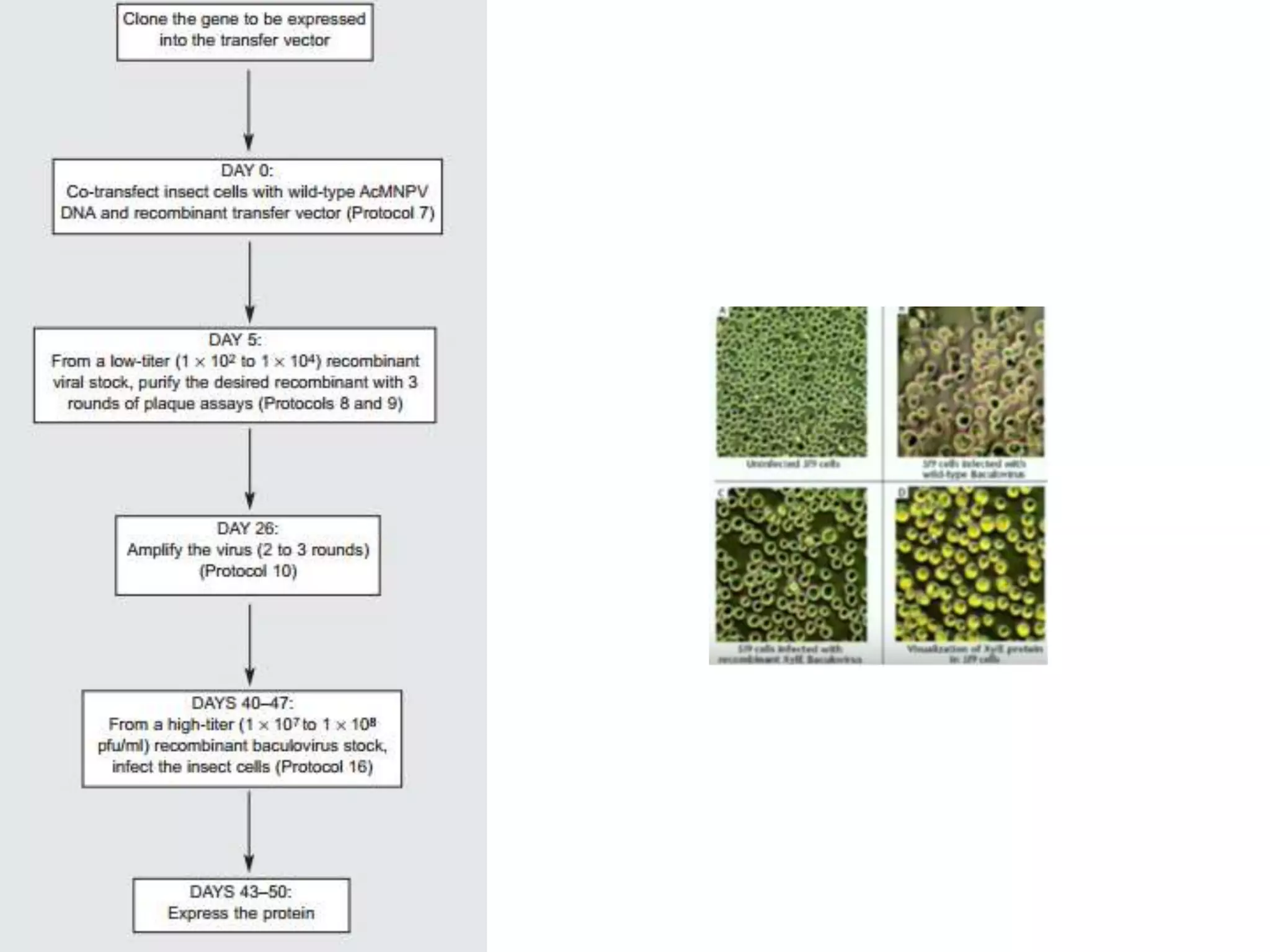 This document summarizes the baculovirus expression system. Baculoviruses can be used as expression vectors by replacing a non-essential viral gene with a gene of interest. The recombinant baculovirus is produced through homologous recombination or using the Bac-to-Bac system. Insect cells are infected with the recombinant baculovirus, which drives high-level expression of the foreign gene. The baculovirus expression system allows safe, scalable production of recombinant proteins for research applications.