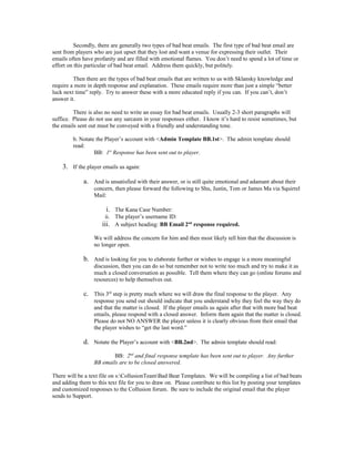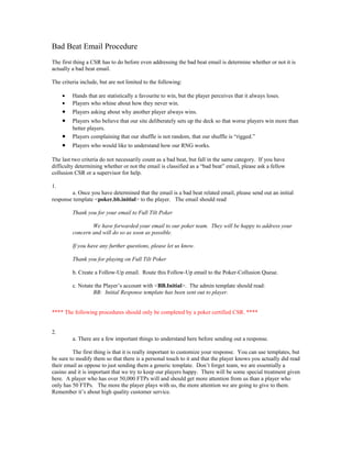 The document outlines procedures for customer service representatives (CSRs) to follow when responding to "bad beat" emails from players. It includes: