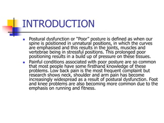 Poor posture is defined as when the spine is positioned in unnatural positions with emphasized curves, putting joints, muscles and vertebrae in stressful positions. Prolonged poor positioning can lead to build up of pressure and cause pain conditions like low back pain and neck, shoulder, and arm pain. Symptoms include body aches and pains, muscle fatigue, and headaches. Physiotherapy can help assess and diagnose postural habits, provide postural education and training, manual therapy, corrective exercises, and advice on activity modification and ergonomics to improve flexibility, strength, and posture.