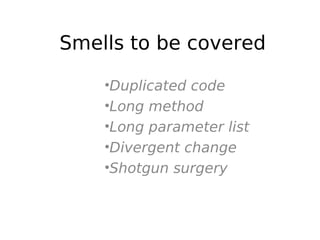 This document discusses code smells that indicate opportunities for refactoring, including duplicated code, long methods, long parameter lists, divergent change, and shotgun surgery. It provides examples of each smell and recommends corresponding refactoring techniques, such as extract method, extract class, introduce parameter object, replace parameter with method, move method, and move field, to improve code design, readability, and maintainability.