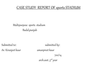 This document provides a case study report of a multipurpose sports stadium located in Badal, Punjab. It includes sections on the introduction and history of stadiums, site analysis, climatic conditions, geography, topography, soil conditions, site characteristics, details about the stadium facilities, pitches, orientation, circulation, and services. The key features of the stadium are that it is spread over 10 acres and can accommodate over 8,000 spectators for various sports including football, kabaddi, and athletics. It has facilities such as a synthetic track, football pitch, and courts for basketball and volleyball.