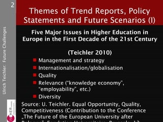 Ulrich Teichler summarizes several reports and scenarios on future challenges facing European higher education systems in the 21st century. The reports focus on issues like expanding access to higher education, improving management strategies, increasing internationalization and globalization, ensuring quality and relevance, promoting diversity, and strengthening ties between education, research, and innovation. Teichler observes that the reports engage in "conservative futurology," looking one to two decades ahead and assuming current issues will remain important, without embracing bold futuristic concepts. The overall themes largely match those identified in Teichler's initial overview.