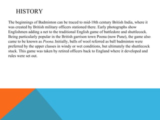 Badminton originated in the mid-18th century in British India where British officers added a net to the game of battledore and shuttlecock. It developed further after being brought back to England where formal rules were established. Badminton is played by two or four players on a marked court with a net, using lightweight rackets to hit a cork shuttlecock back and forth. Key shots in badminton include serves, clears, drops shots, drives, smashes, and net shots which are used to outmaneuver opponents around the court.