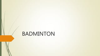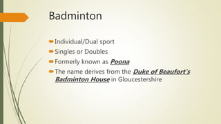 Badminton is a racquet sport that can be played individually or as doubles. It originated in ancient China and was formalized in England in the late 19th century. The game is played on a rectangular court with a net by hitting a shuttlecock back and forth. Players must allow the shuttlecock to bounce once before returning it over the net to the opponent's side. Points are scored by winning rallies or causing opponents to commit faults. Badminton improves eye-hand coordination, agility, speed and reaction time while also cultivating teamwork skills and sportsmanship.