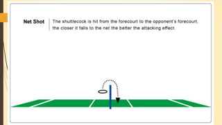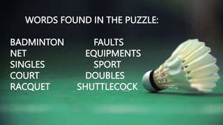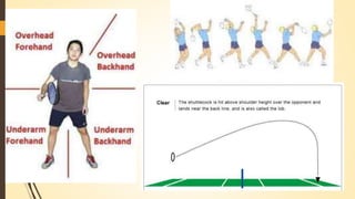 This document provides information about the sport of badminton. It discusses the origins of badminton in England in 1873 and the formation of the Badminton World Federation in 1934. It also outlines the key equipment used in badminton like the racquet, shuttlecock, and net. The scoring system and basic rules of playing singles and doubles are summarized as well.