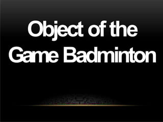 Badminton is a racquet sport played with shuttlecocks over a net on a rectangular court. It can be played individually as singles or with two people on each side as doubles. The aim is to hit the shuttlecock so it passes over the net and lands within the opponent's court without being hit into the net or out of bounds. Scoring involves winning rallies to gain points and games with best of three games needed to win a match. Standard equipment includes racquets, shuttlecocks, court, and net.