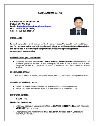 Badusha Mohinudheen is applying for the position of Aircraft Technician. He has a 3-year degree in Aircraft Maintenance Engineering from Flytech Aviation Academy in Avionics. He has experience maintaining various aircraft including the Hawker Siddeley-125 and helicopters. He is currently working as a messenger in Dubai but is looking for a new opportunity in aircraft maintenance where he can utilize his skills and qualifications.