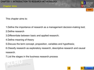 This chapter introduces research methodology. It defines research and differentiates between basic and applied research. It also outlines the steps in the business research process, including introduction, literature review, research methodology, findings and analysis, and recommendation chapters. Key aspects of writing the introduction chapter are discussed, such as the problem statement, research objectives, questions, scope, significance, and limitations of the study.