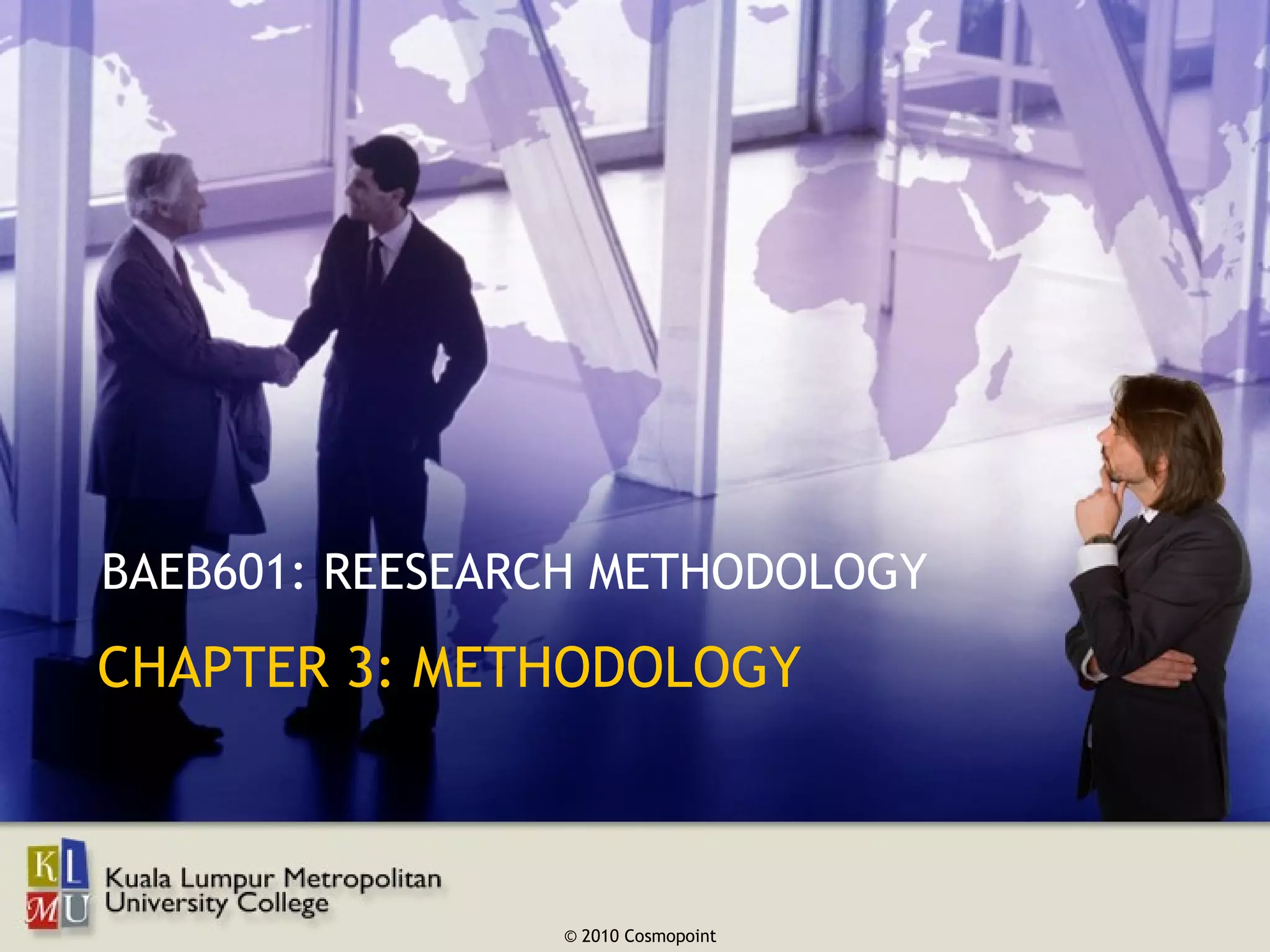 The document discusses research design and methodology. It explains that a research design is a framework that specifies the procedures needed to address a business problem. A good research design ensures the information collected is relevant, necessary information is obtained, and the project is conducted efficiently. It also discusses theoretical frameworks, variables, scales of measurement for variables, and common scaling techniques.