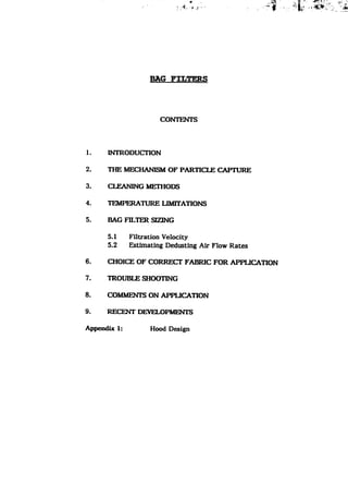 1. The mechanisms of particle capture in bag filters including impaction, diffusion, electrostatic forces, and cake building.