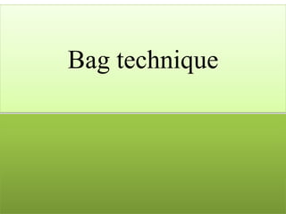 The document discusses the bag technique used by nurses during home visits. The bag technique uses a bag that contains necessary supplies to perform nursing procedures efficiently during visits. It allows nurses to work in a sanitary manner and prevent the spread of infections. The bag should be cleaned regularly and properly stocked. When using the bag technique, nurses should identify a clean work area, wash hands, remove needed supplies, and dispose of waste properly. The overall goal is to provide effective nursing care to clients in their homes while maintaining sanitation.
