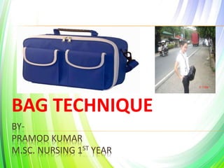 The document describes the bag technique used by community nurses. The bag contains supplies and equipment needed to perform procedures during home visits, such as taking temperatures, urine analysis, and antenatal assessments. It includes items like cotton swabs, bandages, forceps, scissors, solutions, medications, and diagnostic tools. The nurse follows principles like prevention of contamination, protection of caregiver, and making articles readily accessible. The procedure involves washing hands, selecting an area, performing the required procedure, cleaning used items, and documenting observations. The nurse is responsible for ensuring the bag and contents are clean, well-protected, and contain all necessary articles to perform procedures during home visits.