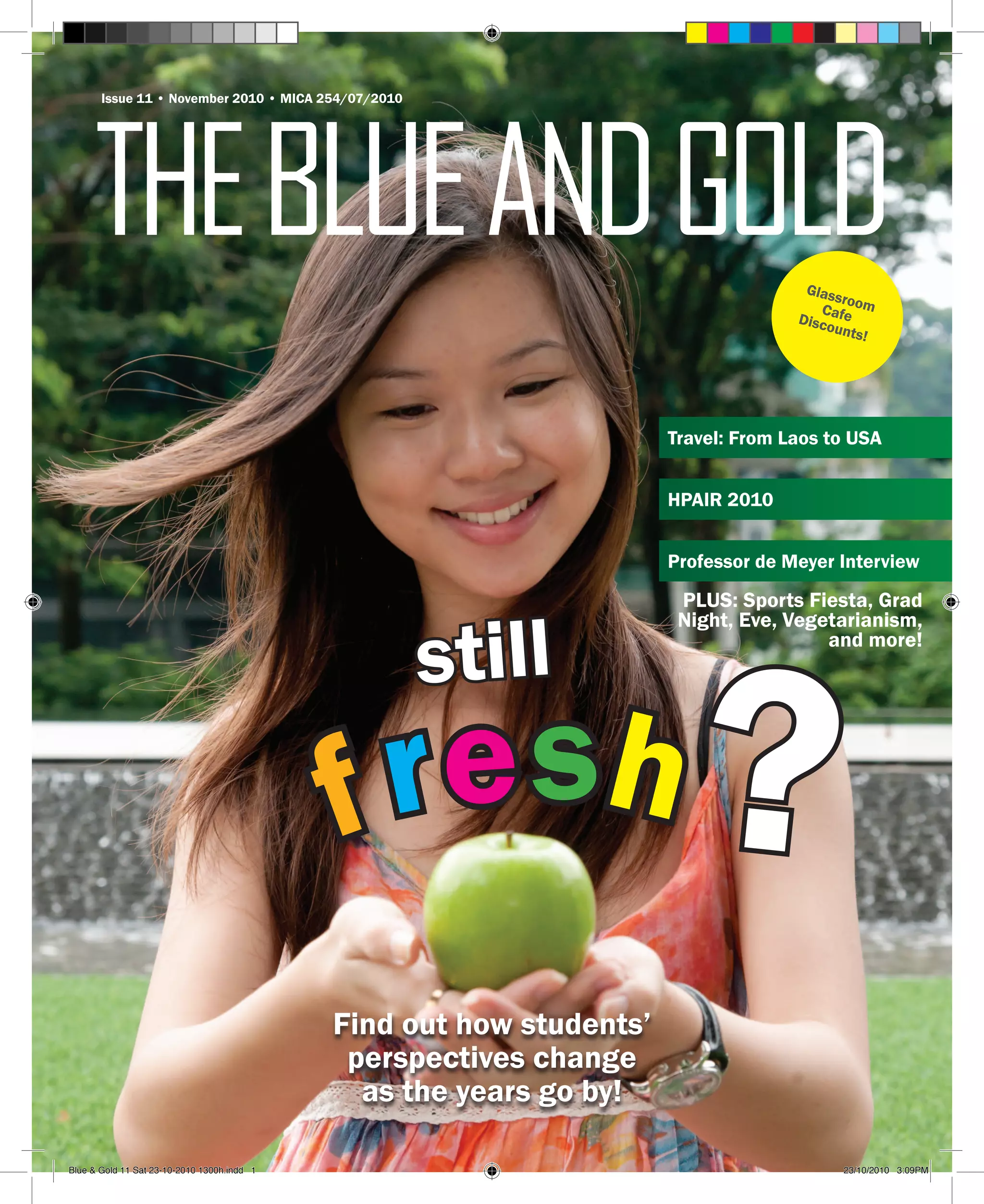 This document is an issue of The Blue and Gold, the student newspaper of the Singapore Management University. It features articles on various campus events, student perspectives, profiles of the new SMU president and SMUSA Exco, reviews of campus performances, reports on conferences and student trips abroad, and a recommendations section. The issue aims to give readers a sense of the various aspects of student life at SMU through diverse content.