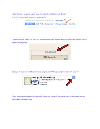 Dokumen ini memberikan panduan tentang cara meletakkan kod HTML/JavaScript dalam blog untuk tujuan menghias. Ini melibatkan proses log masuk ke blog, akses kepada bahagian 'design', menambah gadget, dan menampal kod ke dalam ruangan yang disediakan. Setelah itu, pengguna dapat menyimpan dan melihat hasilnya melalui preview.