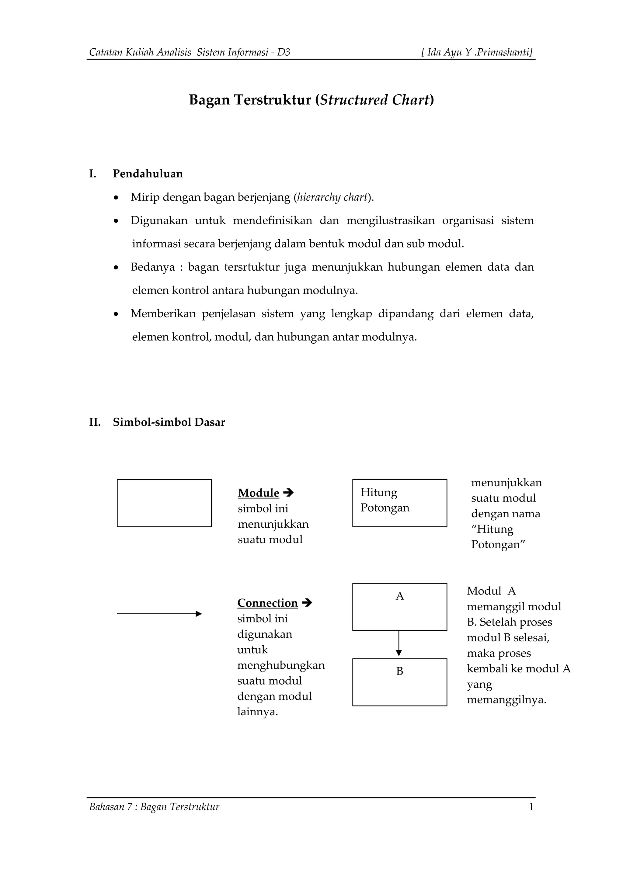 Dokumen ini membahas tentang bagan terstruktur dalam analisis sistem informasi, menjelaskan fungsinya dalam mendefinisikan organisasi sistem secara berjenjang serta hubungan antara modul dan elemen data. Terdapat juga penjelasan tentang simbol-simbol dasar, perulangan, dan keputusan di dalam modul. Selain itu, dokumen ini menyajikan model-model bagan terstruktur seperti transformed-centered dan transaction-centered beserta contohnya.