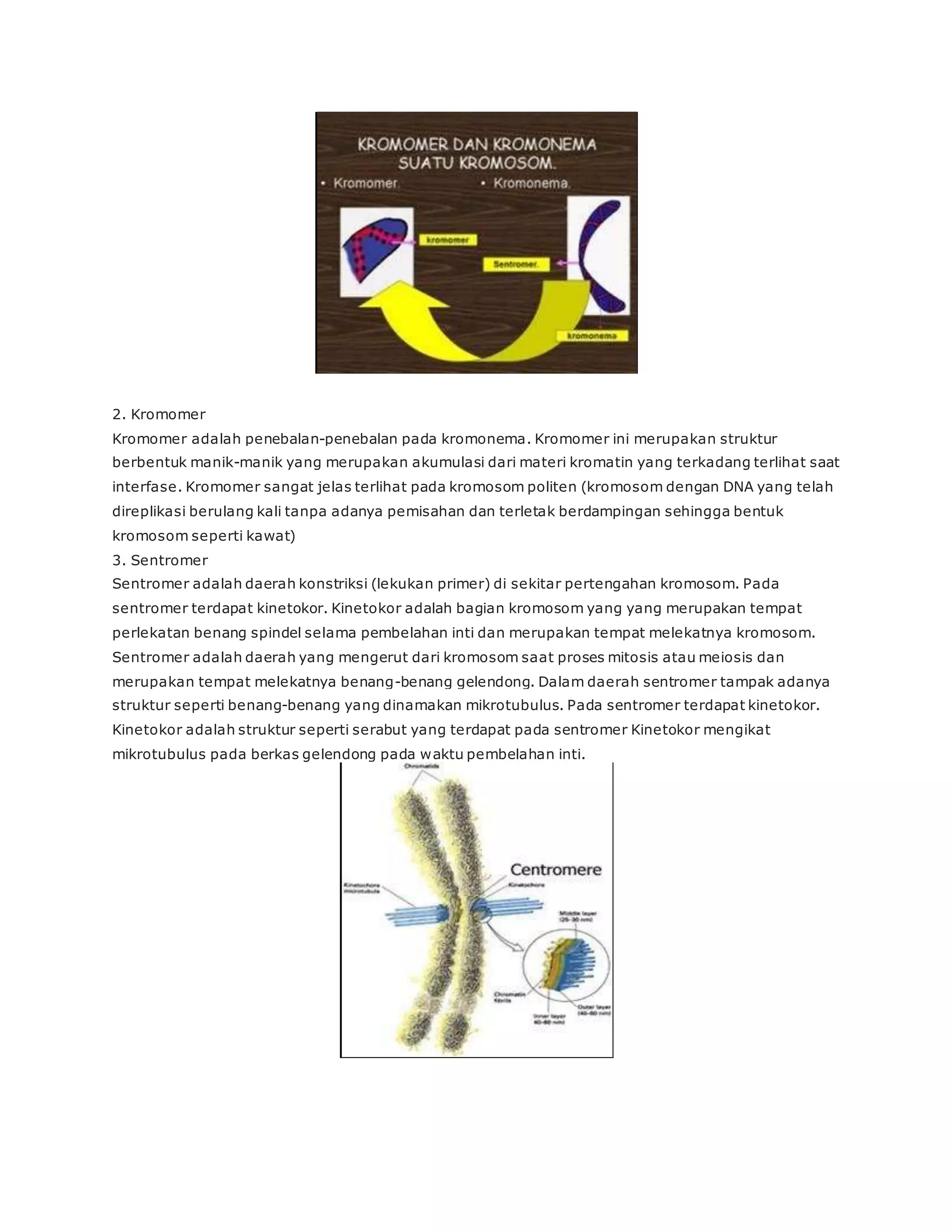 Dokumen ini menjelaskan tentang kromosom, termasuk definisi, morfologi, dan bagian-bagiannya seperti kromatid, sentromer, telomer, dan satelit. Kromosom berfungsi dalam penyimpanan informasi genetik dan dibedakan berdasarkan letak sentromer dan jumlahnya. Selain itu, kromosom juga dibedakan berdasarkan fungsinya menjadi autosom dan kromosom seks.