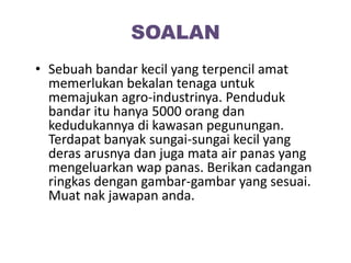 Dokumen ini membincangkan cadangan bekalan tenaga untuk bandar kecil terpencil dengan penduduk 5000 orang yang terletak di kawasan pegunungan. Tiga sumber tenaga yang dicadangkan adalah tenaga solar, hidroelektrik, dan biomas, yang masing-masing mempunyai kelebihan dalam menjana elektrik dan menyokong aktiviti agro-industri penduduk. Penggunaan sumber tenaga ini dapat mengurangkan kebergantungan kepada bahan api fosil dan menyediakan tenaga yang bersih dan boleh diperbaharui.