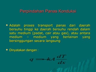 Dokumen tersebut membahas tiga metode perpindahan panas yaitu konduksi, konveksi, dan radiasi. Juga menjelaskan rumus-rumus yang terkait dengan ketiga metode tersebut beserta contoh perhitungannya."