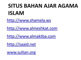Dokumen memberikan informasi tentang cara mencari bahan ajar di Google.com dengan menentukan judul materi dan tipe file seperti doc, pdf, xls, ppt, atau vlc. Dokumen juga memberikan beberapa situs sumber bahan ajar agama Islam seperti shamela.ws, almeshkat.com, almaktba.com, dan saaid.net yang dapat digunakan sebagai referensi.