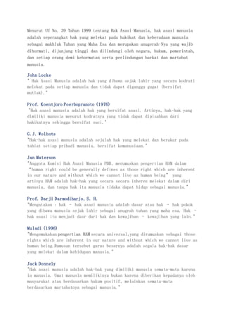 Dokumen tersebut membahas tentang pengertian dan landasan hak asasi manusia di Indonesia. Hak asasi manusia diakui sebagai hak yang melekat pada setiap manusia berdasarkan kemanusiaan yang adil dan beradab sebagaimana tercantum dalam Pembukaan UUD 1945. Berbagai aturan juga mengatur pelaksanaan dan jaminan hak asasi manusia di Indonesia.