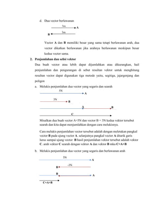 Dokumen ini menjelaskan tentang konsep vektor, mencakup pengertian, penjumlahan, dan pengurangan vektor serta berbagai metode untuk mencapainya, seperti metode segitiga, jajargenjang, dan analitis. Selain itu, dokumen ini menjelaskan cara menguraikan vektor menjadi komponen yang saling tegak lurus. Ditekankan pula perbedaan antara besaran skalar dan vektor serta contoh aplikasi dari teori tersebut.