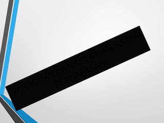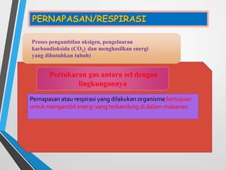 Sistem pernapasan manusia meliputi rongga hidung, faring, laring, trakea, dan paru-paru yang berfungsi untuk mengambil oksigen dan mengeluarkan karbon dioksida. Pernapasan dapat terjadi melalui dada atau perut yang melibatkan kontraksi otot dan pergerakan diafragma untuk mengubah volume rongga dada. Gangguan sistem pernapasan seperti COPD, emfisema, bronkitis, dan pneumonia dapat disebabkan oleh rokok atau