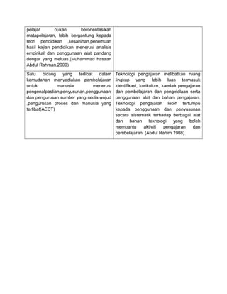 Dokumen ini membahas definisi dan penerapan teknologi pendidikan serta teknologi pengajaran sebagai pendekatan sistematik dalam pengajaran dan pembelajaran. Terdapat penjelasan mengenai persamaan dan perbezaan antara domain teknologi dalam pengajaran dan pembelajaran serta berbagai elemen yang terlibat dalam prosesnya. Fokus utama adalah pada peningkatan kualiti pengajaran melalui penggunaan media dan alat teknologi yang sistematik.