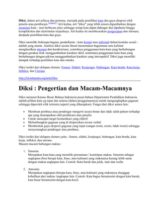 Diksi merujuk pada pemilihan kata dan gaya ekspresi oleh penulis atau pembicara untuk menyampaikan maksud tertentu. Diksi meliputi penggunaan kata yang tepat sesuai konteks sosial, intonasi, dan karakterisasi. Analisis diksi melihat dampak pemilihan kata terhadap makna dan tata bahasa. Diksi harus sesuai dengan audiens dan situasi untuk mencapai komunikasi yang efektif.