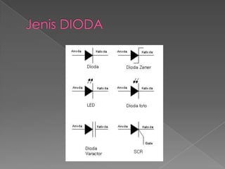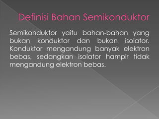 Dokumen ini membahas tentang semikonduktor dan komponen elektronik terkait seperti dioda dan transistor. Semikonduktor adalah bahan yang memiliki sifat antara konduktor dan isolator, contohnya silikon dan germanium. Komponen elektronik seperti dioda dan transistor dapat dirangkai menjadi sirkuit terintegrasi. Silicon Valley dikenal sebagai pusat industri semikonduktor dan komputer.