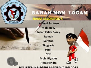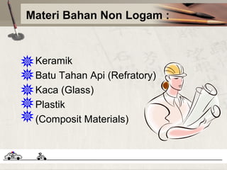 Dokumen ini menguraikan berbagai jenis bahan non-logam seperti keramik, refraktori, kaca, plastik, dan komposit, serta sifat-sifat dan materi dasar mereka. Bahan-bahan ini memiliki aplikasi luas dalam industri karena karakteristiknya yang unik, seperti daya tahan terhadap suhu tinggi dan korosi. Penjelasan rinci tentang proses pembuatan dan komposisi masing-masing bahan juga disertakan.