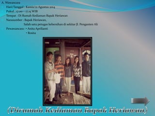 Dokumen ini berisi laporan wawancara dengan Bapak Heriawan, petugas kebersihan di Jl. Penganten Ali. Bapak Heriawan bekerja sebagai petugas kebersihan sejak 2000 dan mengumpulkan 5-6 gerobak sampah per hari dari daerah AMD hingga Sekolah Bina Dharma. Pekerjaannya sangat bermanfaat untuk membersihkan lingkungan.