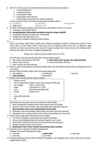 Dokumen ini berisi berbagai soal dan pilihan jawaban yang terkait dengan pengetahuan umum, tata cara belajar, serta cara menyampaikan pendapat. Banyak di antara soal yang melibatkan analisis teks dan pemahaman tentang struktur wacana. Soal-soal tersebut menguji kemampuan membaca, memahami, dan menerapkan ilmu pengetahuan dalam konteks yang berbeda.
