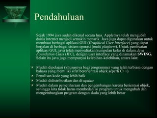 Dokumen ini menjelaskan bahasa pemrograman Java yang telah dikenal sejak 1994 dan dapat digunakan untuk aplikasi GUI multi-platform melalui Java Foundation Class (JFC) dan Swing. Java mudah dipelajari bagi programmer berorientasi objek, serta memudahkan dalam pemeliharaan dan pengembangan aplikasi. Contoh program sederhana juga disediakan, menunjukkan implementasi metode main dan penggunaan JOptionPane untuk menampilkan pesan.