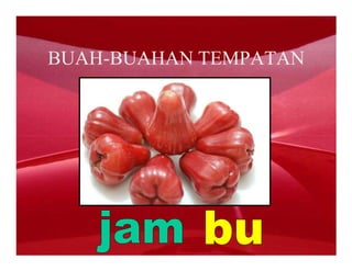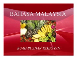 Dokumen ini menjelaskan tentang berbagai jenis buah-buahan tempatan di Malaysia, seperti duku, nangka, manggis, dan durian. Buah-buahan ini tidak hanya lezat tetapi juga kaya akan khasiat bagi kesehatan. Selain itu, harga buah-buahan ini terjangkau dan mudah didapatkan.